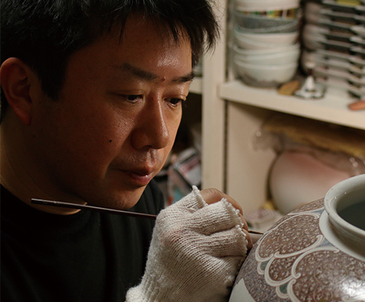ところが、ある程度、作品的にも技術的にも評価をいただけるようになる中で、ある日、ふと空しくなったんです。自分は石川県で育ち、父(真生窯・宮本忠夫氏)が九谷焼をやっている。なぜ、その息子が自分のルーツや環境とは違った作品を作っているのだろう、と。以前は何か新しいものを作ろうとしたとき、着想は外から持ってきていましたが、そのアイデアやヒントは、実はうちの仕事や九谷焼の歴史の中にこそあると気付いたんです。よくよく父の仕事を見てみると、あれほど緻密な仕事や緑・紫・紺青・黄・赤のきれいな原色五彩は国内にも世界にもないですし、これを使わない手はないな、と。それ以来、ガラッと変わって、素直に地元や土着のものを認めることができて、とことん産地性にこだわったものを作るようになりました。